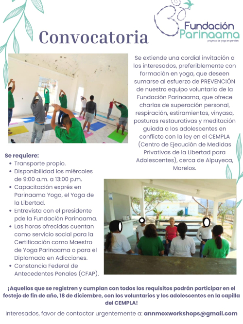 El Proyecto de Fundación Parinaama es un esfuerzo de 23 años totalmente voluntario de profesores de yoga de varias tradiciones diferentes (incluyendo Iyengar, Anusara, Vini-Yoga, Ashtanga, Power Yoga y Kundalini) principalmente de la Ciudad de México, Cuautla, Cuernavaca para llevar herramientas de transformación, rehabilitación y manejo de estrés a espacios de reclusión y a parques públicos para la prevención de adicciones. Estamos dedicados a llevar Hatha yoga, meditación, pranayama, conciencia cuerpo-mente detrás de las rejas. Nuestro esfuerzo ha sobrevivido sin financiación de ningún tipo más que alguna que otra donación individual, de la tradición de Siddha Yoga, de la Escuela Iyengar de Ciudad de México, del Instituto Mexicano de Yoga, de la Iglesia de St. Michael’s de Cuernavaca, de regalos de boda y del tiempo y dinero del voluntariado.