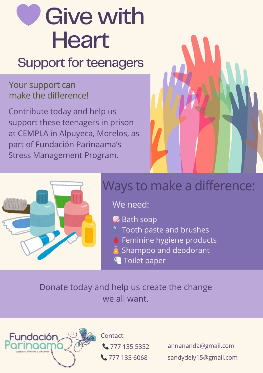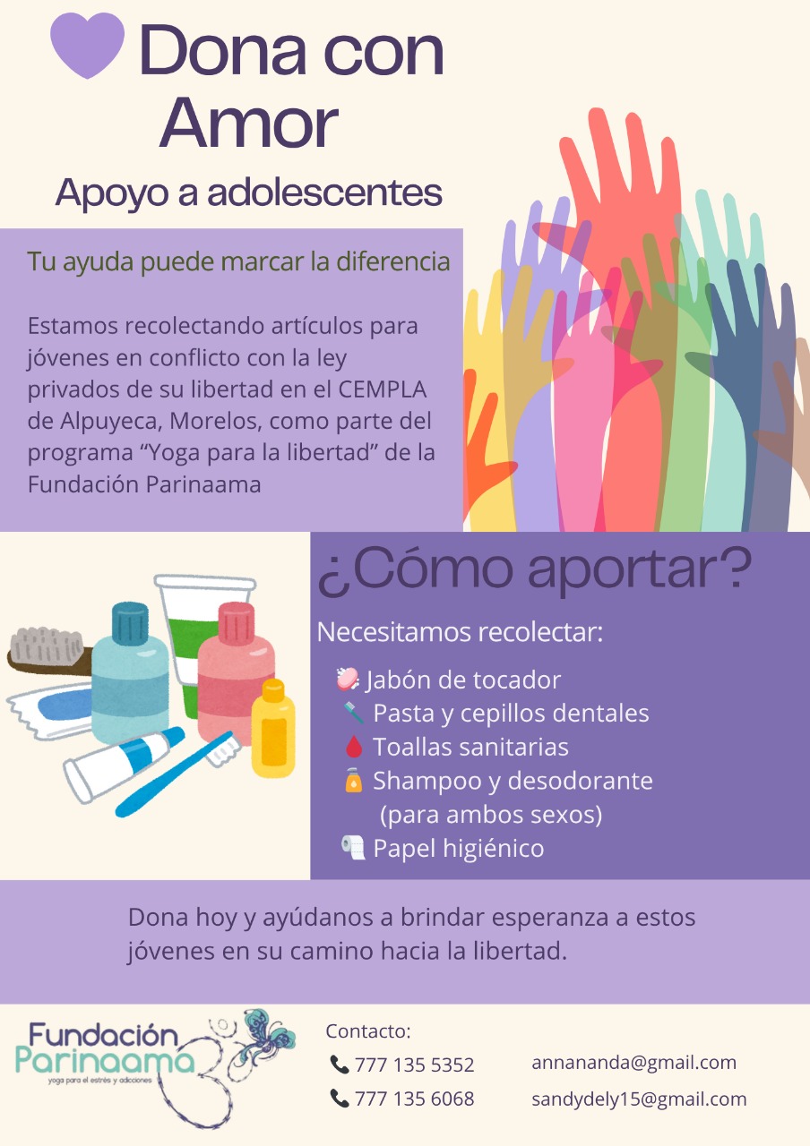 Actualmente, hemos cumplido 3 años en los penales para adolescentes en Alpuyeca, Morelos. En el CEMPLA, Centro de Ejecución de Medidas Privativas de la Libertad para Adolescentes ofrecemos platicas, cursos, clases de yoga y Tai Chi. Cada año, como el actual, organizamos una campaña de donaciones de productos de higiene personal que se entrega al final de año.