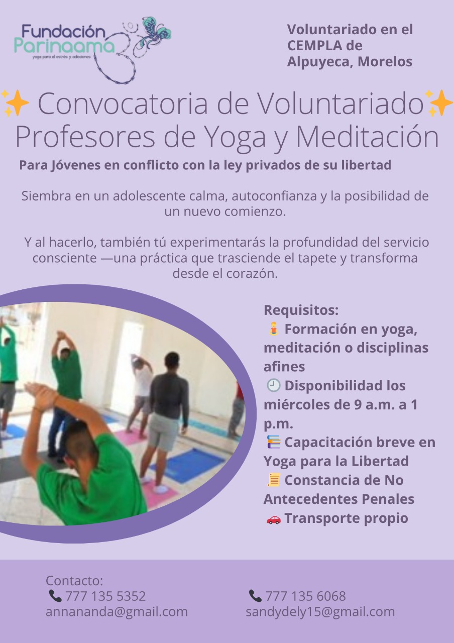 El Proyecto de Fundación Parinaama es un esfuerzo de 23 años totalmente voluntario de profesores de yoga de varias tradiciones diferentes (incluyendo Iyengar, Anusara, Vini-Yoga, Ashtanga, Power Yoga y Kundalini) principalmente de la Ciudad de México, Cuautla, Cuernavaca para llevar herramientas de transformación, rehabilitación y manejo de estrés a espacios de reclusión y a parques públicos para la prevención de adicciones. Estamos dedicados a llevar Hatha yoga, meditación, pranayama, conciencia cuerpo-mente detrás de las rejas. Nuestro esfuerzo ha sobrevivido sin financiación de ningún tipo más que alguna que otra donación individual, de la tradición de Siddha Yoga, de la Escuela Iyengar de Ciudad de México, del Instituto Mexicano de Yoga, de la Iglesia de St. Michael’s de Cuernavaca, de regalos de boda y del tiempo y dinero del voluntariado.